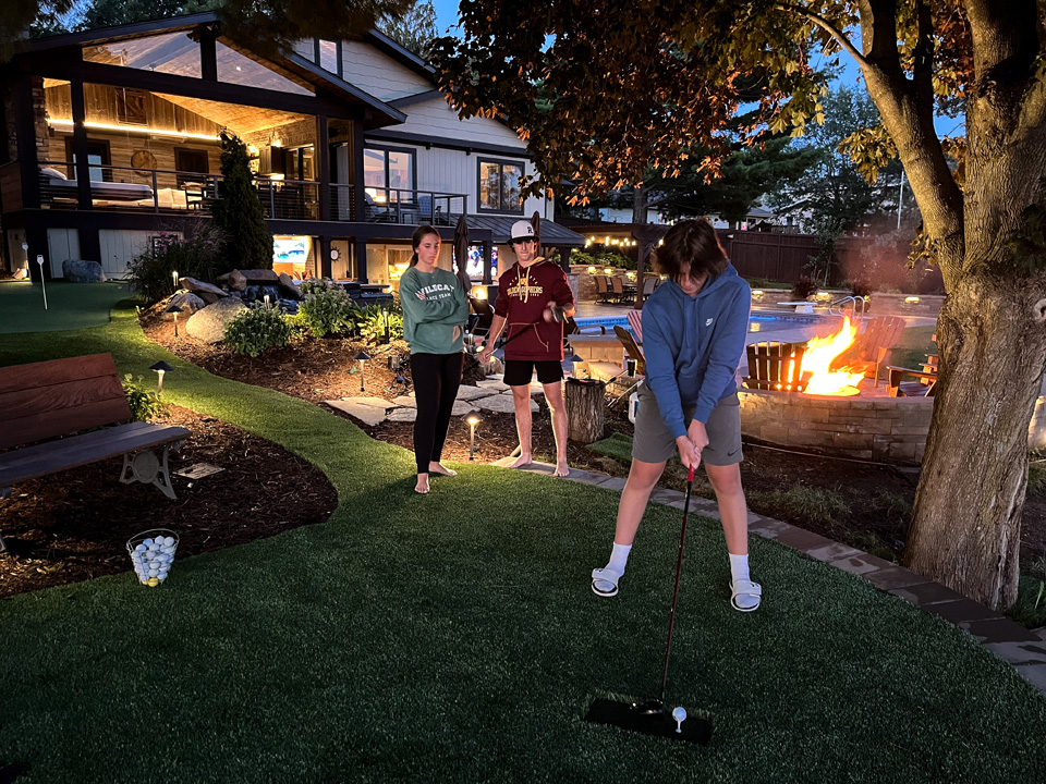 Putting green connected to a tee box by a winding fairway. Flagstone walkways connect to the front yard and firepit / pool area. The final piece to an amazing property overlooking the Mississippi River. Yardage to the river – 180 yards front, 350 yards middle, 620 yards to carry.